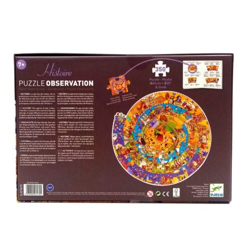 Παζλ 350 κομματιών από την εταιρεία Djeco, που θα βοηθήσει τους μικρούς μας φίλους να κατανοήσουν την ιστορία της εξέλιξης, με διασκεδαστικό και πολύχρωμο τρόπο. Κατασκευάστε το κυκλικό παζλ και ταξιδέψτε στο χρόνο, χρησιμοποιώντας το βιβλιαράκι της συσκευασίας, που σας δίνει λεπτομέρειες για κάθε εποχή. Ανακαλύψτε στοιχεία και γεγονότα της προϊστορίας, της αρχαιότητας, του μεσαίωνα, της μοντέρνας εποχής και της σύγχρονης εποχής. Διαστάσεις κουτιού: 34x23x5 εκατοστά. Διάμετρος: 65 εκατοστά. Κατάλληλο για παιδιά από 7 ετών.