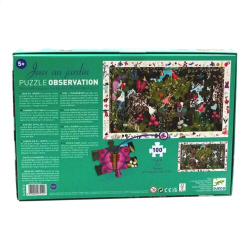 Ένας καταπράσινος κήπος και μία παιδική χαρά γεμάτη εκπλήξεις που περιμένουν να τις ανακαλύψετε! Το παζλ της εταιρείας DJeco περιλαμβάνει 100 κομμάτια από υψηλής ποιότητας πεπιεσμένο χαρτόνι, καθώς και μια αφίσα με την εικόνα του. Αφού κατασκευάσετε το παζλ, παρατηρήστε τα αντικείμενα που υπάρχουν περιμετρικά στην εικόνα και προσπαθήστε να τα εντοπίσετε μέσα σε αυτό. Κατάλληλο από 5 χρονών και άνω. Διαστάσεις παζλ: 61 x 38 εκ. Διαστάσεις Συσκευασίας: 34 x 23 εκ. Προϊόν από υλικό πιστοποιημένο με FSC Mix (μείγμα υλικών από δάση πιστοποιημένα με FSC, ανακυκλωμένα υλικά ή / και ξύλο ελεγχόμενο από FSC)