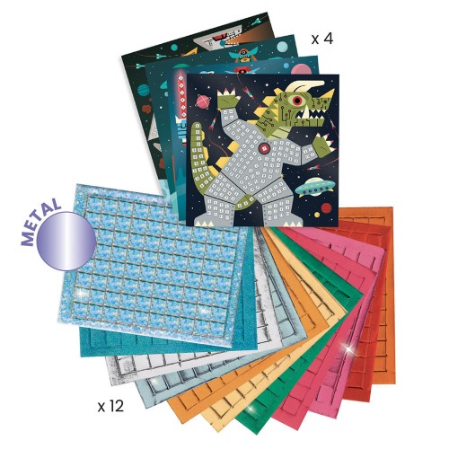 Κατασκευή με την τεχνική του μωσαϊκού από την εταιρία Djeco. Το σετ περιλαμβάνει 4 καρτέλες, στις οποίες τα ρομπότ καλούνται να αντιμετωπίσουν τα τέρατα. Τα παιδιά τις διακοσμούν με μεταλλιζέ ψηφίδες και οι εικόνες αποκτούν ζωντάνια! Οι ψηφίδες είναι αυτοκόλλητες και το κάθε χρώμα αντιστοιχεί σε έναν αριθμό. Το σετ περιλαμβάνει εγχειρίδιο οδηγιών. Κατάλληλο για ηλικίες από 5 ετών και άνω. Διαστάσεις συσκευασίας: 21.5 x 21.5 x 4 εκ. Διαστάσεις Προϊόντος: 20 x 20 εκ.