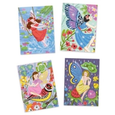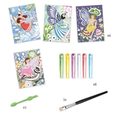 Τέσσερις εικόνες με νεράιδες, περιτριγυρισμένες από όμορφα λουλούδια και πουλιά, περιμένουν να τις στολίσετε με χρυσόσκονη, ώστε να λάμπουν. Απλώς αφαιρέστε το κάλυμμα από κάθε αριθμημένη περιοχή χρησιμοποιώντας το ειδικό εργαλείο, πασπαλίστε με το σωστό χρώμα χρυσόσκονης και στη συνέχεια ισιώστε με το πινέλο για να καλύψετε ομοιόμορφα όλη την επιφάνεια. Μια λαμπερή χειροτεχνία της εταιρείας Djeco κατάλληλη για παιδιά από 7 ετών και άνω. Η συσκευασία περιέχει 4 καρτέλες διακόσμησης, 6 σωληνάρια με γκλίτερ σε διαφορετικά χρώματα, 1 πινέλο, 1 ειδικό εργαλείο για ξύσιμο και 1 βιβλίο οδηγιών με εικόνες. Διαστάσεις 17 x 4 x 23 εκ.