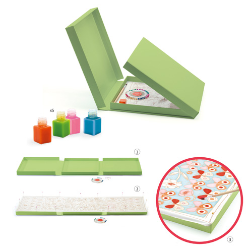 Χρωματίστε το δικό σας φουλάρι και δημιουργήστε ένα μοναδικό αξεσουάρ για να χαρίσετε στον εαυτό σας ή στις φίλες σας! Το κουτί ανοίγει και λειτουργεί σαν βάση για να σταθεροποιήσετε το φουλάρι καθώς το χρωματίζετε. Το σετ περιλαμβάνει 1 μεταξωτό φουλάρι με προτυπωμένα σχέδια, καρφίτσες, 5 μπουκαλάκια με διαφορετικό χρώμα, 1 πινέλο και εικονογραφημένες οδηγίες. Κατασκευασμένο από την εταιρία Djeco. Κατάλληλο από 8 έως 14 ετών. Διαστάσεις 21 x 4 x 21 εκ.