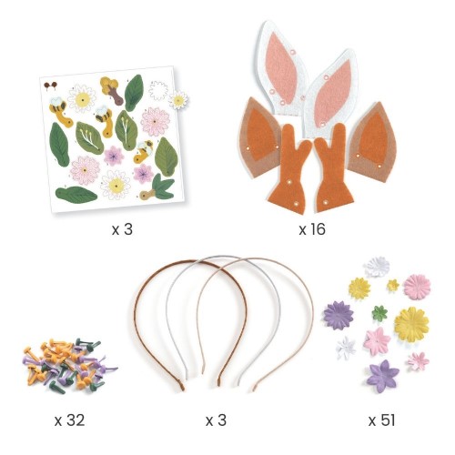 Το απόλυτο σετ χειροτεχνίας για μικρούς δημιουργούς, από την εταιρεία Djeco. Φτιάξτε τρεις πανέμορφες στέκες για τα μαλλιά και διακοσμήστε τες με αυτάκια, λουλούδια και κομψές floral λεπτομέρειες. Τα αυτάκια είναι κατασκευασμένα από εύκαμπτο, αυτοκόλλητο τσόχινο υλικό, που εφαρμόζει εύκολα. Οι στέκες είναι άνετες στη χρήση και προσθέτουν μια διασκεδαστική boho πινελιά που δεν χάνει ποτέ τη γοητεία της! Η δραστηριότητα είναι ιδανική για να την απολαύσουν πολλά παιδιά μαζί, ενώ οι αναλυτικές οδηγίες καθοδηγούν βήμα-βήμα τη δημιουργία, εξασφαλίζοντας ένα όμορφο και μοναδικό αποτέλεσμα. Το σετ περιλαμβάνει τρία ζευγάρια τσόχινων, αυτοκόλλητων αυτιών, τρεις στέκες, 50 ανάγλυφα χάρτινα λουλούδια σε διάφορα σχέδια και χρώματα, τέσσερα φύλλα με προ-κομμένες floral διακοσμήσεις, 32 πολύχρωμα μεταλλικά στηρίγματα και ένα αναλυτικό εγχειρίδιο οδηγιών. Κατάλληλο από 6 ετών και άνω.