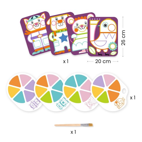 Ένα έξυπνα σχεδιασμένο σετ ζωγραφικής της εταιρείας Djeco, που δίνει στα παιδιά την ευκαιρία να πειραματιστούν με τα χρώματα σαν μικροί καλλιτέχνες! Χάρη στις παλέτες που είναι τυπωμένες απευθείας πάνω στα φύλλα, τα παιδιά ζωγραφίζουν χωρίς ακαταστασία και χωρίς να χρειάζονται επιπλέον υλικά. Λίγο νερό είναι αρκετό για να αραιώσει το χρώμα. Οι περιοχές με ειδικό βερνίκι περιορίζουν τις υπερχειλίσεις χρώματος, βοηθώντας τα παιδιά να πετύχουν όμορφο αποτέλεσμα, ενώ παράλληλα ενισχύουν την αυτοπεποίθηση και τη δημιουργικότητά τους. Το σετ περιλαμβάνει: 4 σκηνές για να ζωγραφίσουν τα παιδιά, 4 ενσωματωμένες παλέτες χρωμάτων, 1 πινέλο με ξύλινη λαβή, εικονογραφημένο φυλλάδιο οδηγιών (χωρίς κείμενο). Ιδανικό για πρώτη επαφή με τη ζωγραφική, αναπτύσσει τον συντονισμό ματιού-χεριού, την παρατηρητικότητα και την καλλιτεχνική έκφραση.